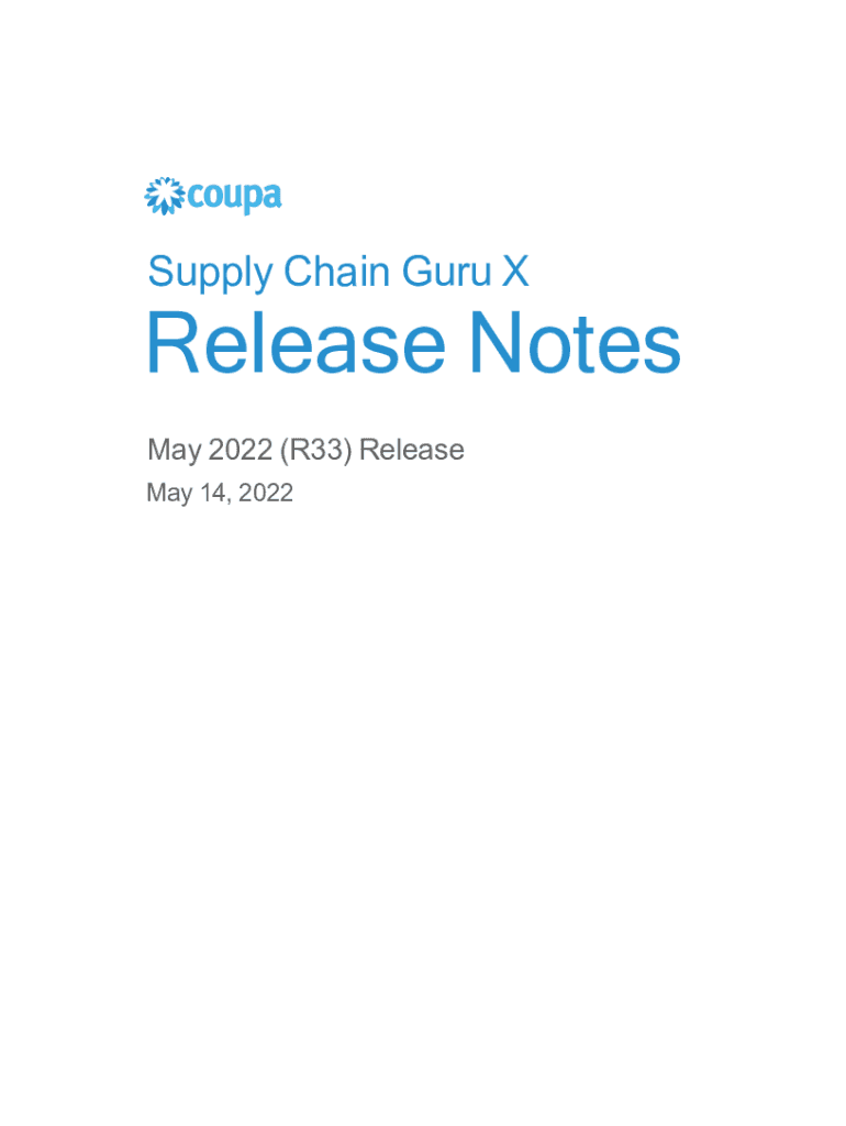 Supply Chain Guru XReleaseNotes May 2022 (R33) Release May 14, 2022 2022 Coup Software, Inc. Copyright notice. All materials within this document and the document itself are protected by U.S. and