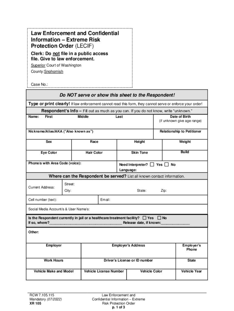 Law Enforcement Extreme Risk Protection Order Packet Use this packet if: You are filing during BUSINESS HOURS (8am3:30pm) You are filing on behalf of a Law Enforcement Agency in Snohomish County The