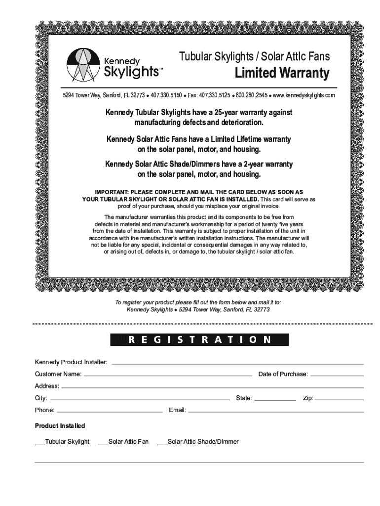 Tubular Skylights / Solar Attic Unlimited Warranty5294 Tower Way, Sanford, FL 32773 407.330.5150 Fax: 407.330.5125 800.280.2545 www.kennedyskylights.comKennedy Tubular Skylights have a 25year warranty