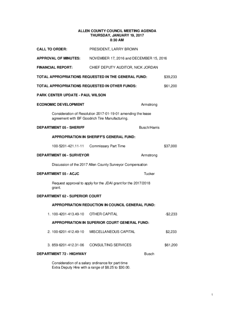 ALLEN COUNTY COUNCIL MEETING AGENDA THURSDAY, JANUARY 19, 2017 8:30 AM CALL TO ORDER:PRESIDENT, LARRY BROWNAPPROVAL OF MINUTES:NOVEMBER 17, 2016, and DECEMBER 15, 2016FINANCIAL REPORT:CHIEF DEPUTY