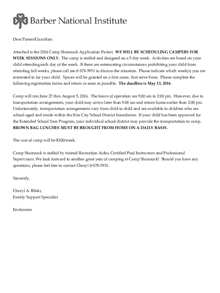 Dear Parent/Guardian: Attached is the 2016 Camp Shamrock Application Packet. WE WILL BE SCHEDULING CAMPERS FOR WEEK SESSIONS ONLY. The camp is staffed and designed on a 5-day week. Activities are