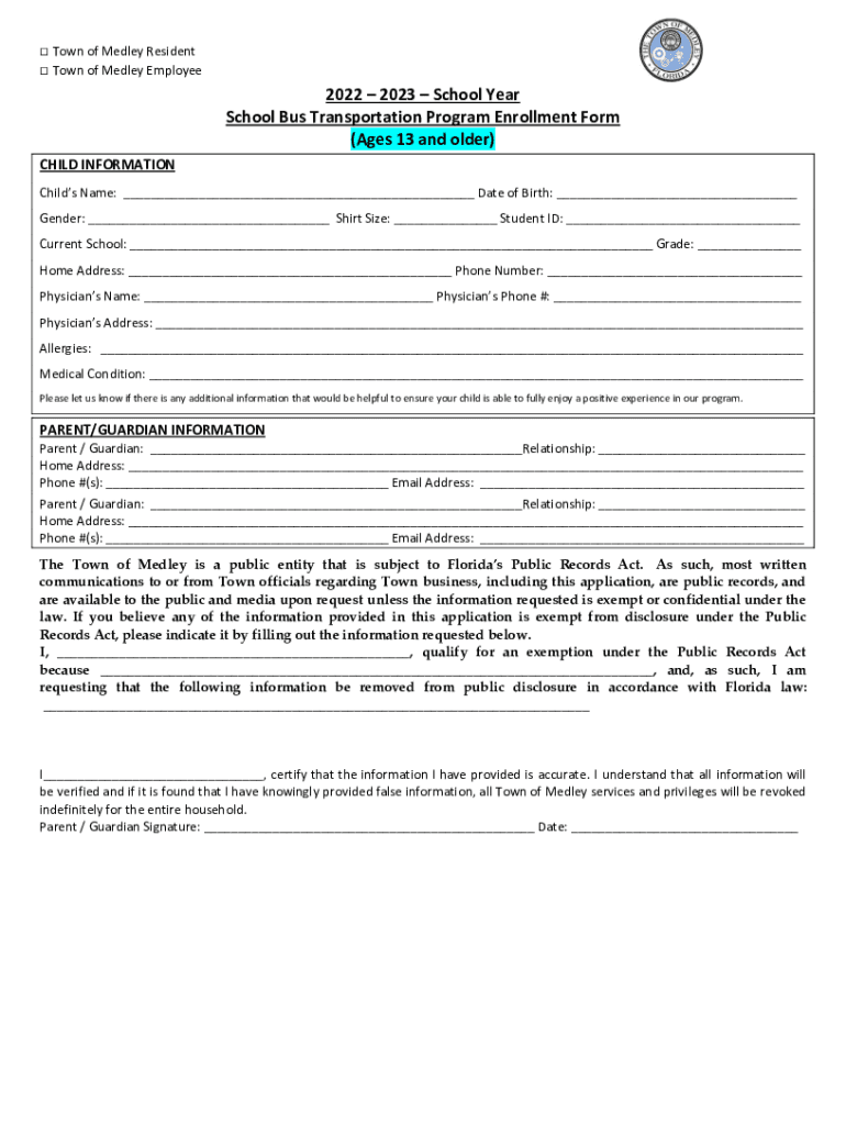 Town of Medley Resident Town of Medley Employee2022 2023 School Year School Bus Transportation Program Enrollment Form (Ages 13 and older) CHILD INFORMATION Child's Name: ___ Date of Birth: ___ Gender: