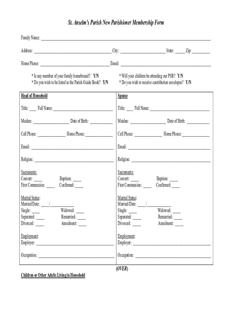 St. Anselm's Parish New Parishioner Membership Form Family Name: ___ Address: ___ City: ___ State: ___ Zip: ___ Home Phone: ___ Email: ___ * Is any member of your family home bound? Y/N * Do you wish