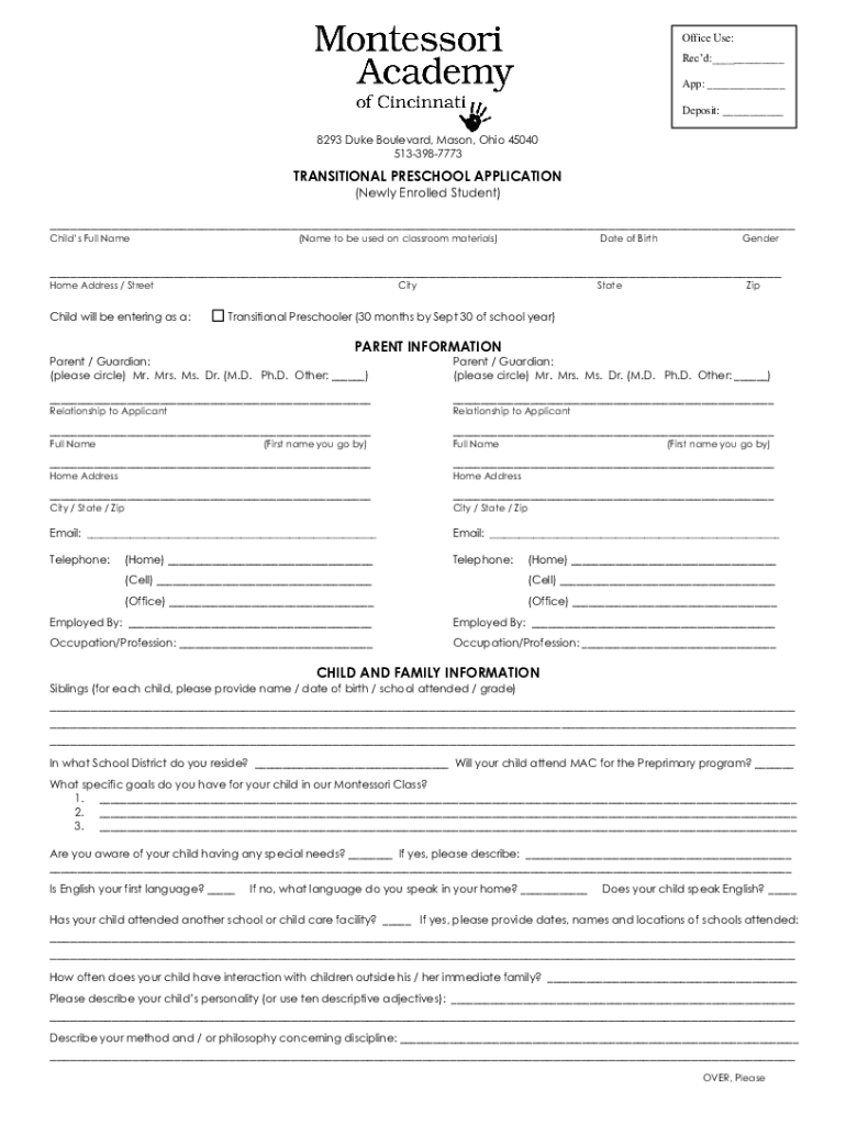 Office Use: Recd:___ App: ___ Deposit: ___ 8293 Duke Boulevard, Mason, Ohio 45040 5133987773TRANSITIONAL PRESCHOOL APPLICATION (Newly Enrolled Student)___ Child's Full Name(Name to be used on classroom