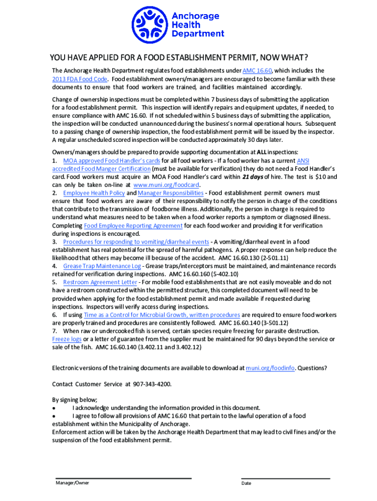 YOU HAVE APPLIED FOR A FOOD ESTABLISHMENT PERMIT, NOW WHAT? The Anchorage Health Department regulates food establishments under AMC 16.60, which includes the 2013 FDA Food Code. Food establishment