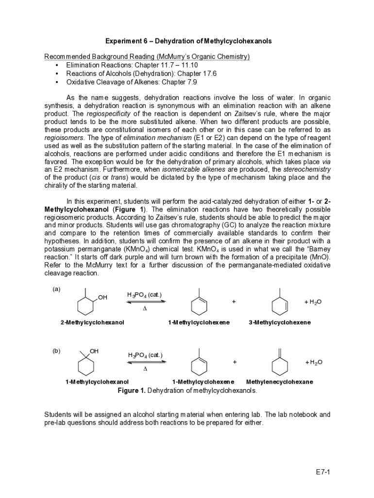 Experiment 6 Dehydration of Methylcyclohexanols Recommended Background Reading (McMurray Organic Chemistry) Elimination Reactions: Chapter 11.7 11.10 Reactions of Alcohols (Dehydration): Chapter 17.6
