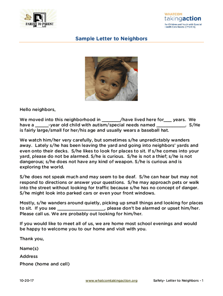 Sample Letter to NeighborsHello neighbors, We moved into this neighborhood in ___/have lived here for___ years. We have a ___year old child with autism/special needs named ___. S/He is fairly large/small