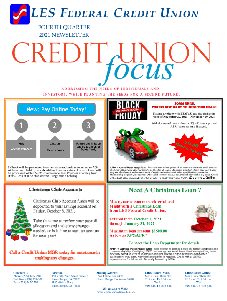 LES Federal Credit Union FOURTH QUARTER 2021 NEWSLETTERCredit UnionfocusADDRESSING THE NEEDS OF INDIVIDUALS AND INVESTORS, WHILE PLANTING THE SEEDS FOR A SECURE FUTURE. ZOOM ON IN, YOU DO NOT WANT