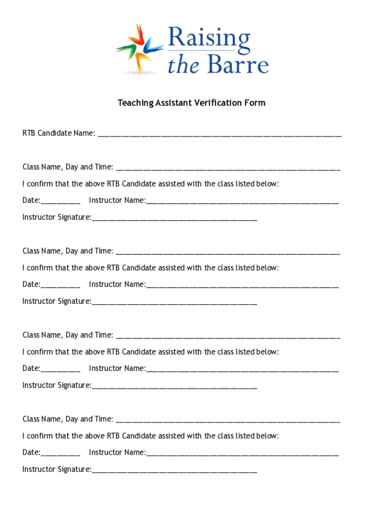 Teaching Assistant Verification Form RTB Candidate Name: ___Class Name, Day and Time: ___ I confirm that the above RTB Candidate assisted with the class listed below: Date:___Instructor Name:___Instructor