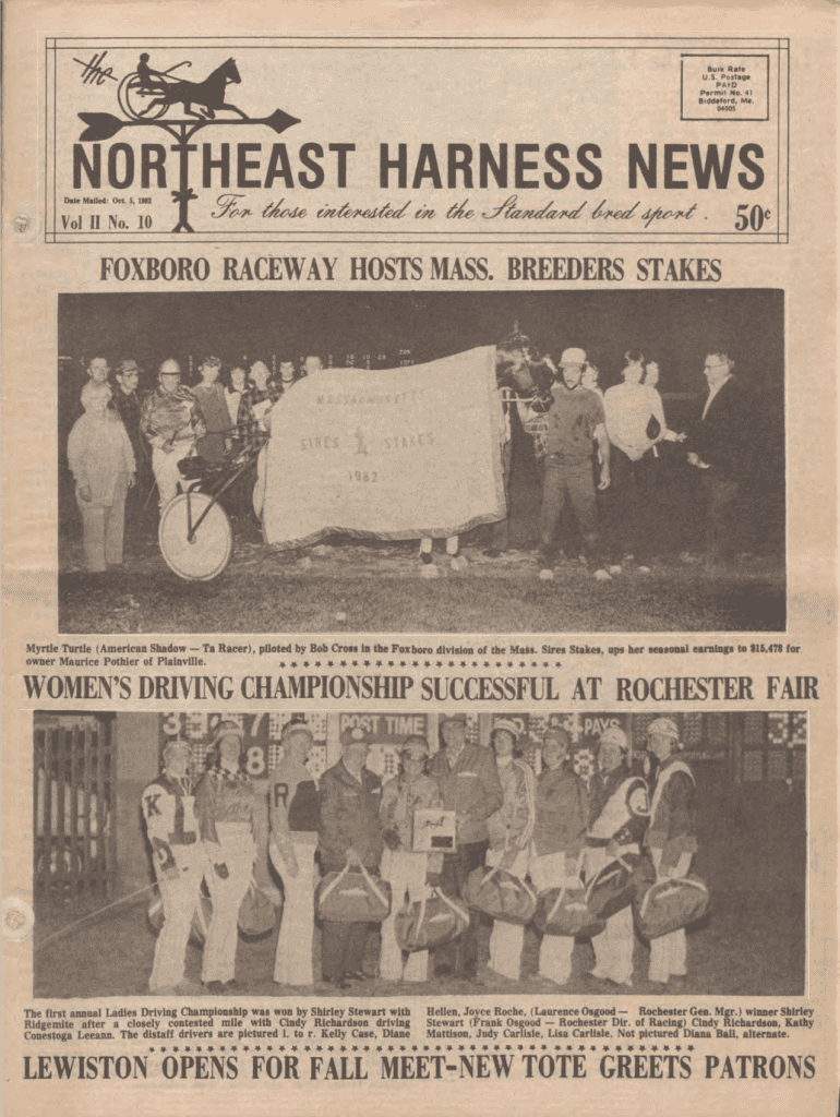 Bulk Rate U.S. Postage P A ID Perm it No. 41 Middleford, Me. 04005EAST HARNESS NEWS BC m.JR FORBORE RACEWAY HOSTS MASS. BREEDERS STAKES Myrtle Turtle (American Shadow Ta Racer), piloted by Bob Cross