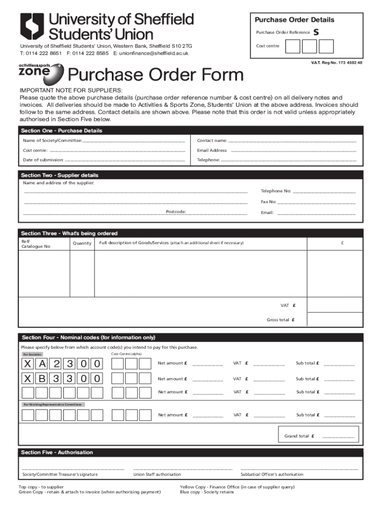Purchase Order ReferenceUniversity of Sheffield Students Union, Western Bank, Sheffield S10 2TG