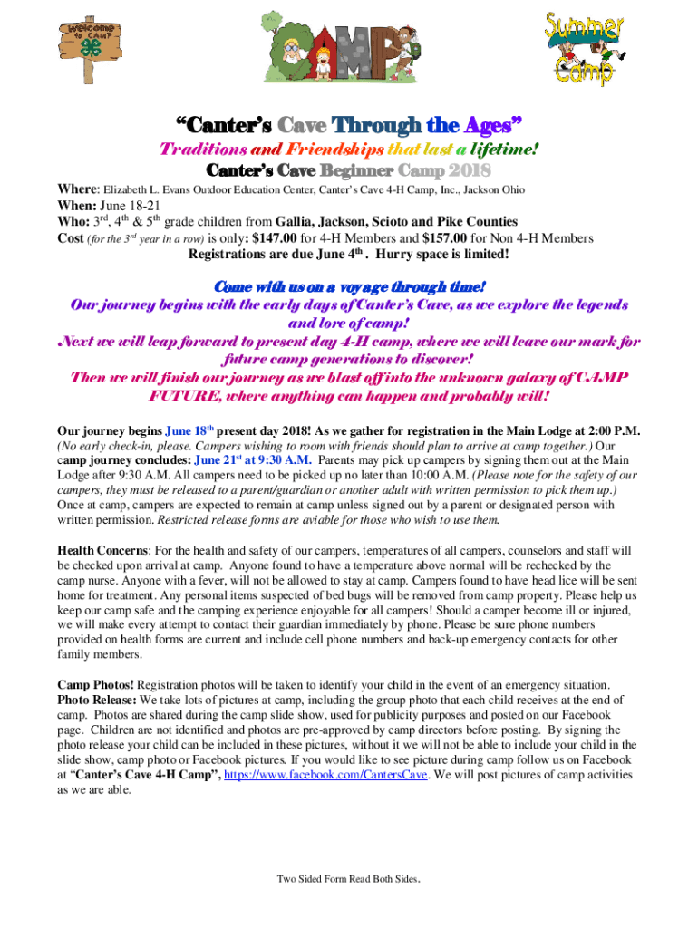 Canters Cave Through the Ages Traditions and Friendships that last a lifetime! Canters Cave Beginner Camp 2018 Where: Elizabeth L. Evans Outdoor Education Center, Canters Cave 4H Camp, Inc., Jackson