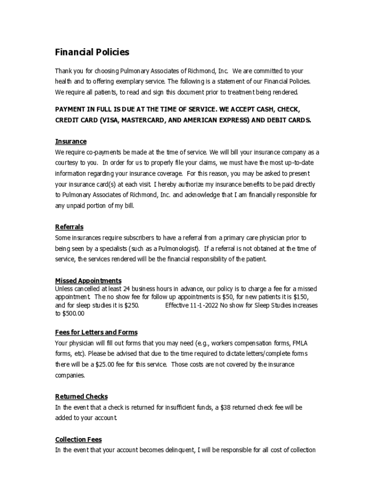 Financial Policies Thank you for choosing Pulmonary Associates of Richmond, Inc. We are committed to your health and to offering exemplary service. The following is a statement of our Financial Policies.