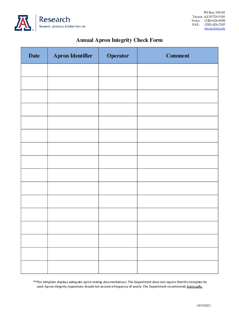 PO Box 245101 Tucson, AZ 857245101 Voice: (520) 6266850 FAX: (520) 6262583 Ross. Arizona.annual Apron Integrity Check Form DateApron IdentifierOperatorComment**This template displays adequate apron