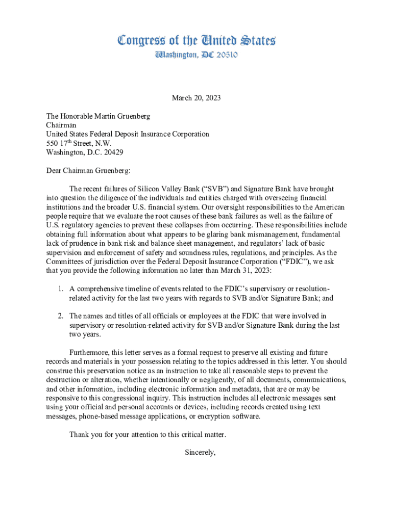 March 20, 2023, The Honorable Martin Greenberg Chairman United States Federal Deposit Insurance Corporation 550 17th Street, N.W. Washington, D.C. 20429 Dear Chairman Greenberg: The recent failures