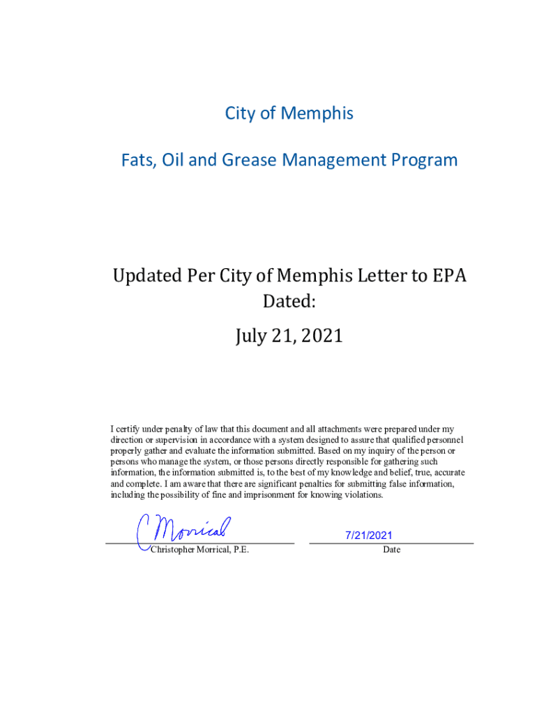 CityofMemphis Fats, OilandGreaseManagementProgramUpdated Per City of Memphis Letter to EPA Dated: July 21, 2021I certify under penalty of law that this document and all attachments were prepared under
