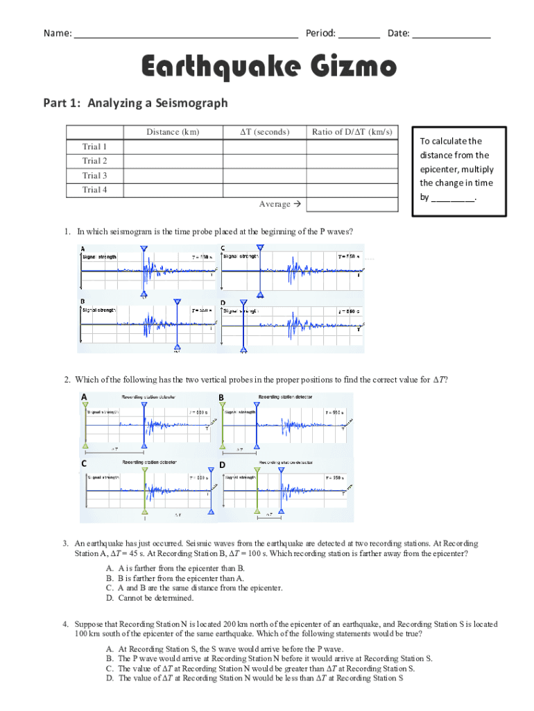 Name: ___ Period: ___ Date: ___Earthquake Gizmo Part 1: Analyzing a Seismograph T (seconds)Distance (km)Ratio of D/T (km/s)Trial 1 Trial 2 Trial 3 Trial 4 Average To calculate the distance from the