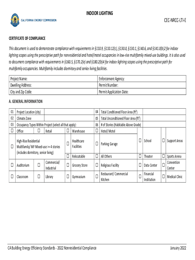 INDOOR LIGHTING CECNRCCLTIE CERTIFICATE OF COMPLIANCE This document is used to demonstrate compliance with requirements in 110.9, 110.12(c), 130.0, 130.1, 140.6, and 141.0(b)2 for indoor lighting