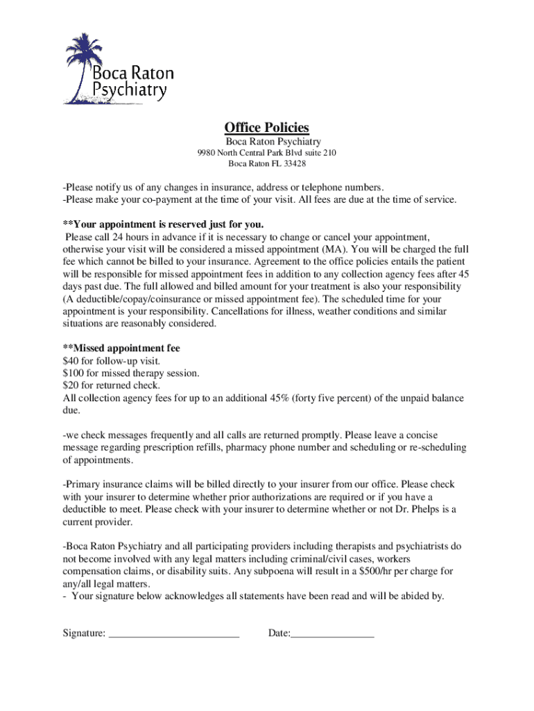 Office Policies Boca Raton Psychiatry 9980 North Central Park Blvd suite 210 Boca Raton FL 33428Please notify us of any changes in insurance, address or telephone numbers. Please make your co-payment