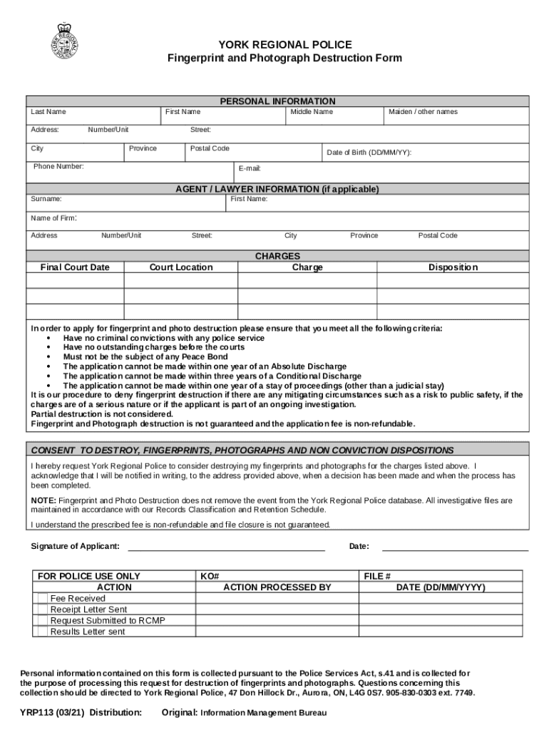 What is Fingerprint & Photograph Destruction Application Form?