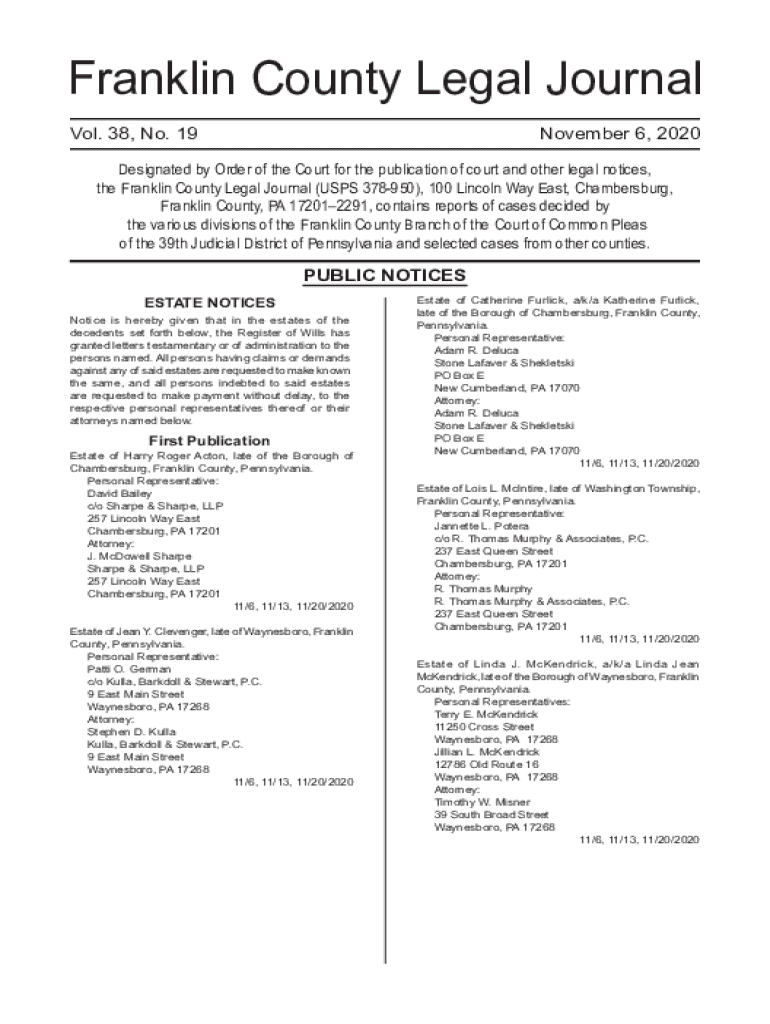 Franklin County Legal Journal Vol. 38, No. 19November 6, 2020Designated by Order of the Court for the publication of court and other legal notices, the Franklin County Legal Journal (USPS 378950),