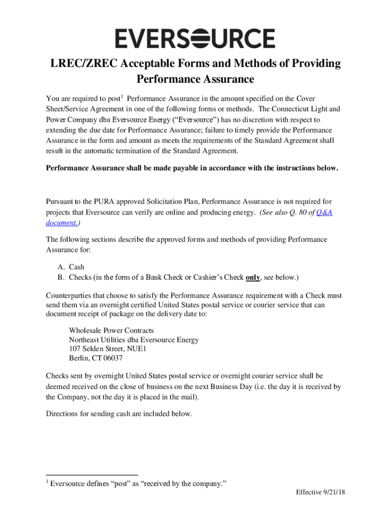 LRC/REC Acceptable Forms and Methods of Providing Performance Assurance You are required to post1 Performance Assurance in the amount specified on the Cover Sheet/Service Agreement in one of the following