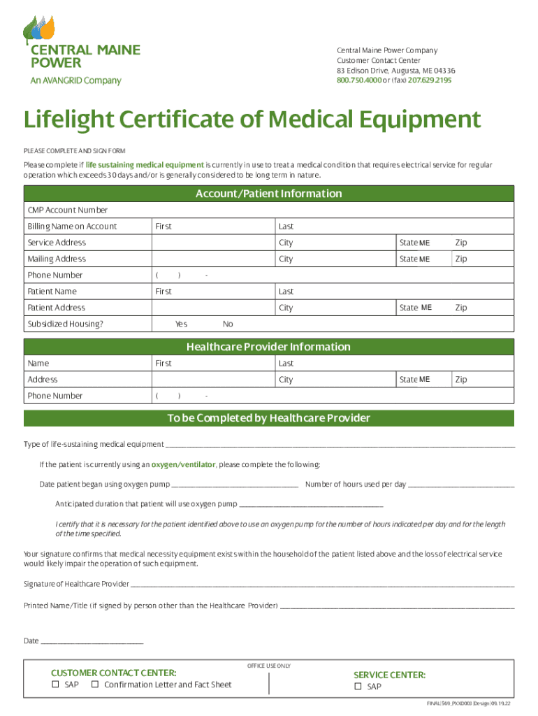 Central Maine Power Company Customer Contact Center 83 Edison Drive, Augusta, ME 04336 800.750.4000 or (fax) 207.629.2195Lifelight Certificate of Medical Equipment PLEASE COMPLETE AND SIGN Formulas