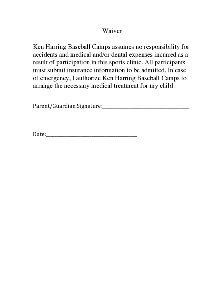 Waiver Ken Harding Baseball Camps assumes no responsibility for accidents and medical and/or dental expenses incurred as a result of participation in this sports clinic. All participants must submit
