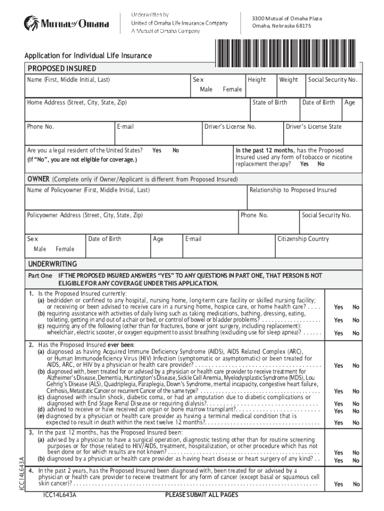 3300 Mutual of Omaha Plaza Omaha, Nebraska 68175Application for Individual Life Insurance PROPOSED INSURED Name (First, Middle Initial, Last)HeightSexWeightSocial Security No. Male Female Home Address