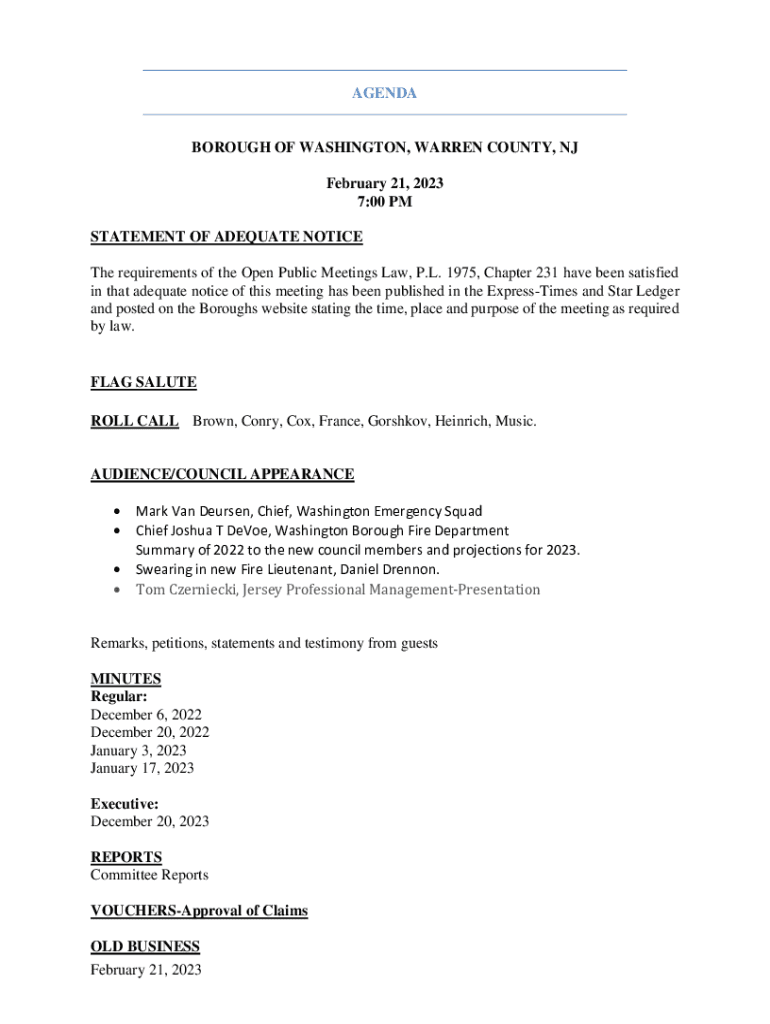 AGENDABOROUGH OF WASHINGTON, WARREN COUNTY, NJ February 21, 2023 7:00 PM STATEMENT OF ADEQUATE NOTICE The requirements of the Open Public Meetings Law, P.L. 1975, Chapter 231 have been satisfied in