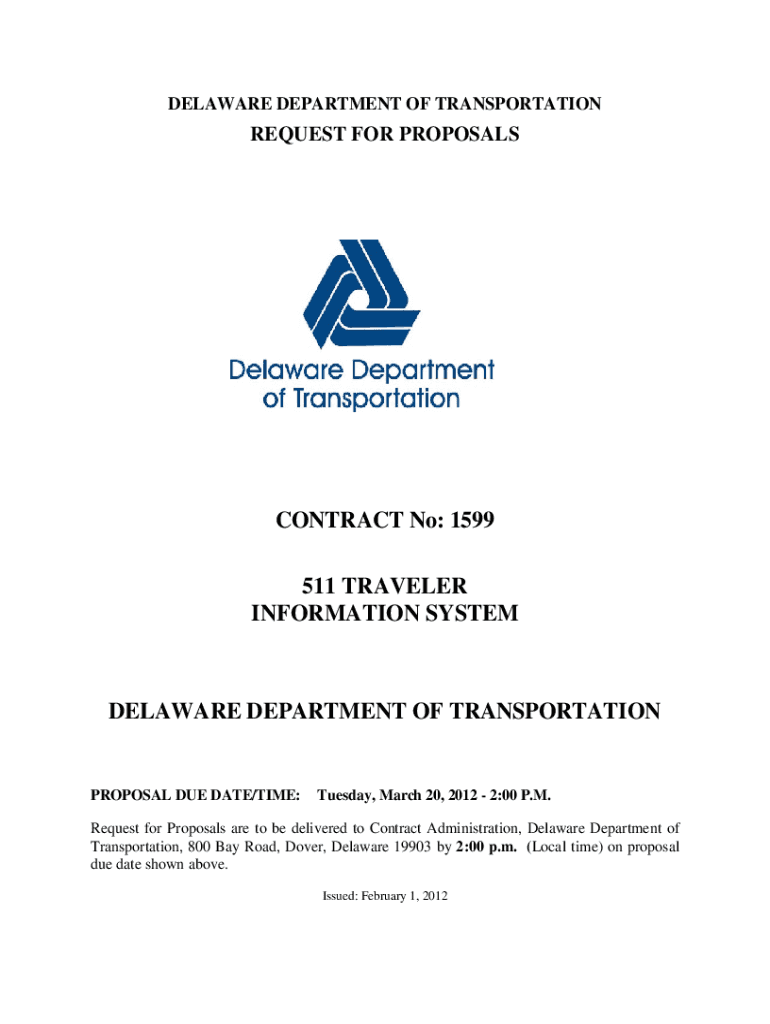 DELAWARE DEPARTMENT OF TRANSPORTATIONREQUEST FOR PROPOSALSCONTRACT No: 1599 511 TRAVELER INFORMATION SYSTEMDELAWARE DEPARTMENT OF TRANSPORTATIONPROPOSAL DUE DATE/TIME:Tuesday, March 20, 2012 2:00