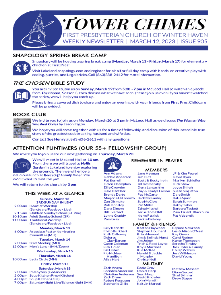 TOWER CHIMES APOLOGY SPRING BREAK CAMP Sn apology will be hosting a spring break camp (Monday, March 13 Friday, March 17) for elementary children at First Pres! Visit Lakeland.snapology.com and register