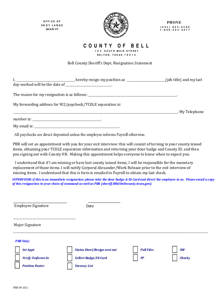 OFFICE FPO NEEDY LARGE(254) 9335400 18002343277SHERIFFC O U N T Y 104O FB E LL SOUTH MAIN STREETBELTON, TEXAS 7 6 5 1 3Bell County Sheriffs Dept. Resignation Statement I, ___, hereby resign my position
