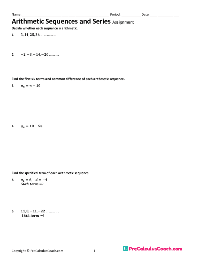 Name: ___ Period: ___ Date: ___Arithmetic Sequences and Series Assignment Decide whether each sequence is arithmetic. 1.,,, 2.,,,. Find the first six terms and common difference of each arithmetic