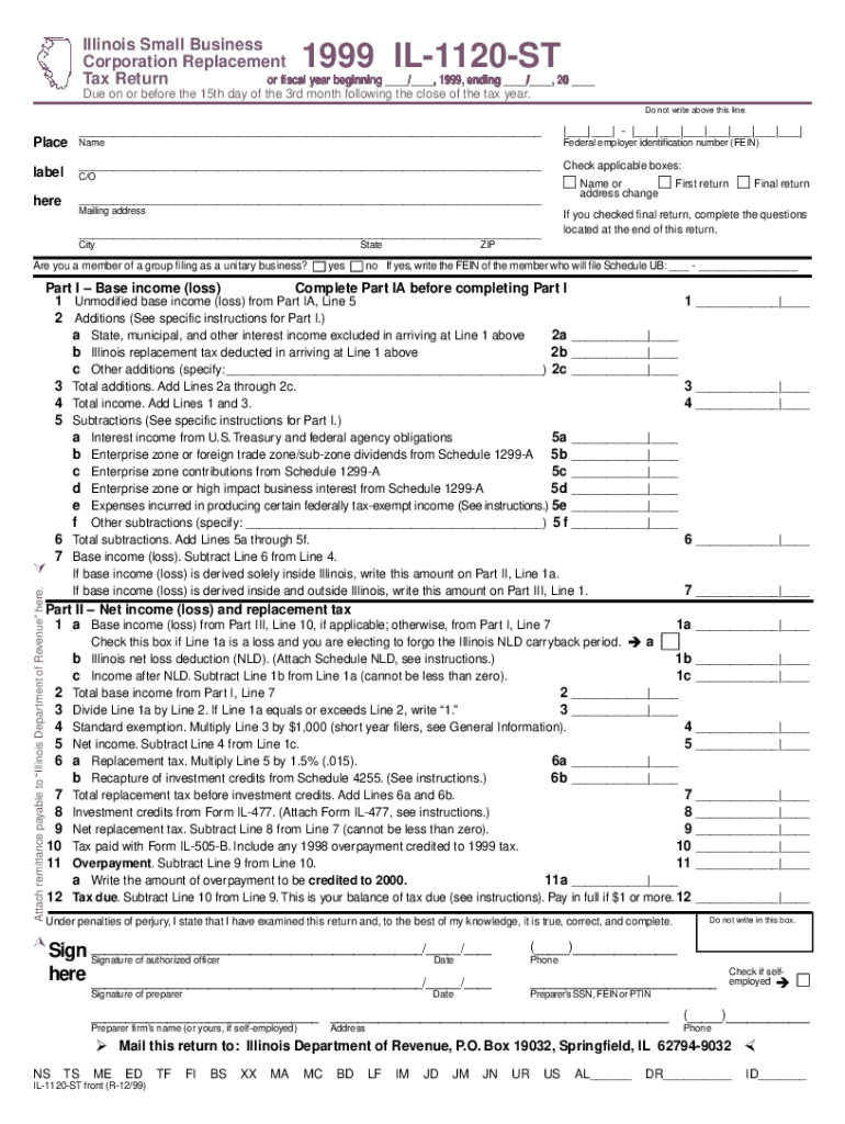 Illinois Small Business Corporation Replacement or fiscal year ear beginning ___/___, 1999, ending ___/___, 20 ___ Tax Return1999 IL1120STDue on or before the 15th day of the 3rd month following the