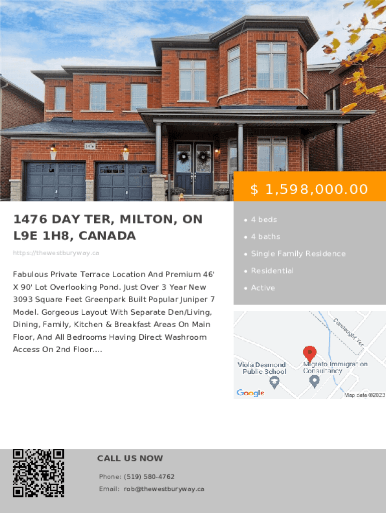 $1,598,000.00 1476 DAY TER, MILTON, ON L9E 1H8, CANADA4 bedshttps://thewestburyway.single Family ResidenceFabulous Private Terrace Location And Premium 46\' X 90\' Lot Overlooking Pond. Just Over