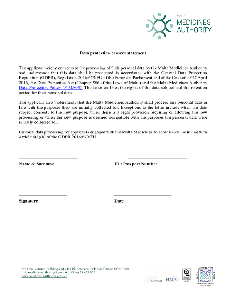 Data protection consent statement The applicant hereby consents to the processing of their personal data by the Malta Medicines Authority and understands that this data shall be processed in accordance