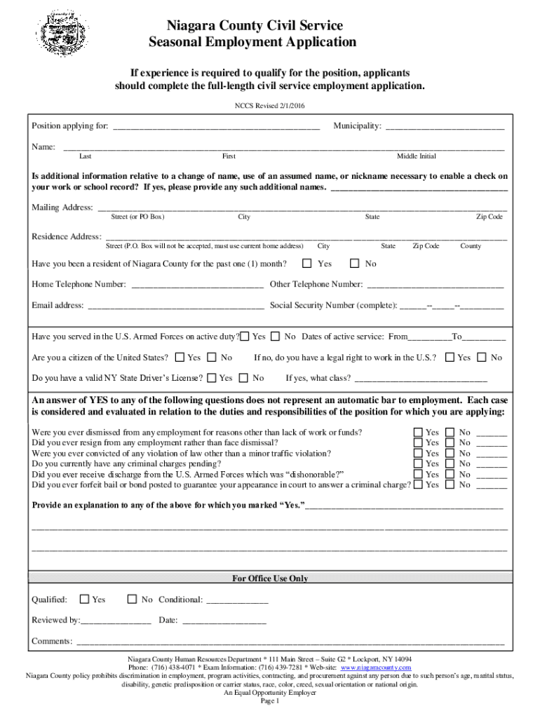 Niagara County Civil Service Seasonal Employment Application If experience is required to qualify for the position, applicants should complete the full length civil service employment application.