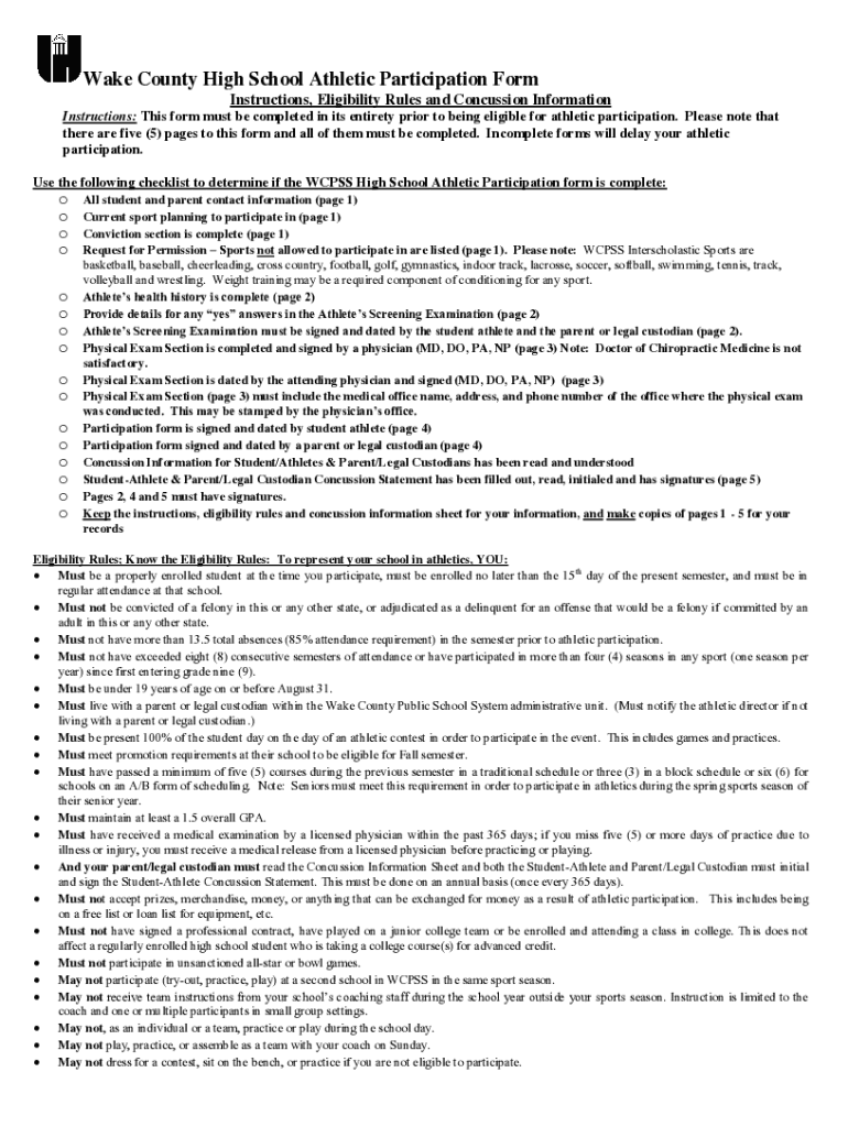 Wake County High School Athletic Participation Form Instructions, Eligibility Rules and Concussion Information Instructions: This form must be completed in its entirety prior to being eligible for