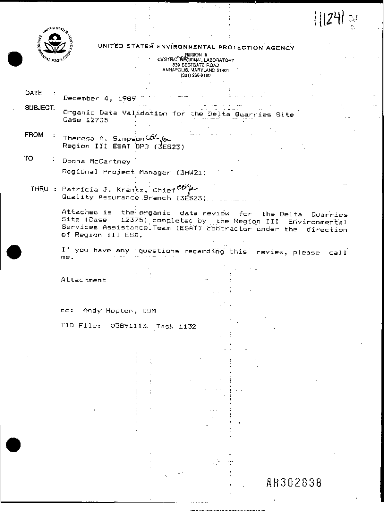 I2HI UNITED STATES ENVIRONMENTAL PROTECTION AGENCY. . . REGION III + _ CENTRAL \” REGIONAL LABORATORY 839 ESTATE ROAD ANNAPOLIS, MARYLAND 21401 (301)2669180DATE:SUBJECT:\' TO1 _ _ December 4, 1989.
