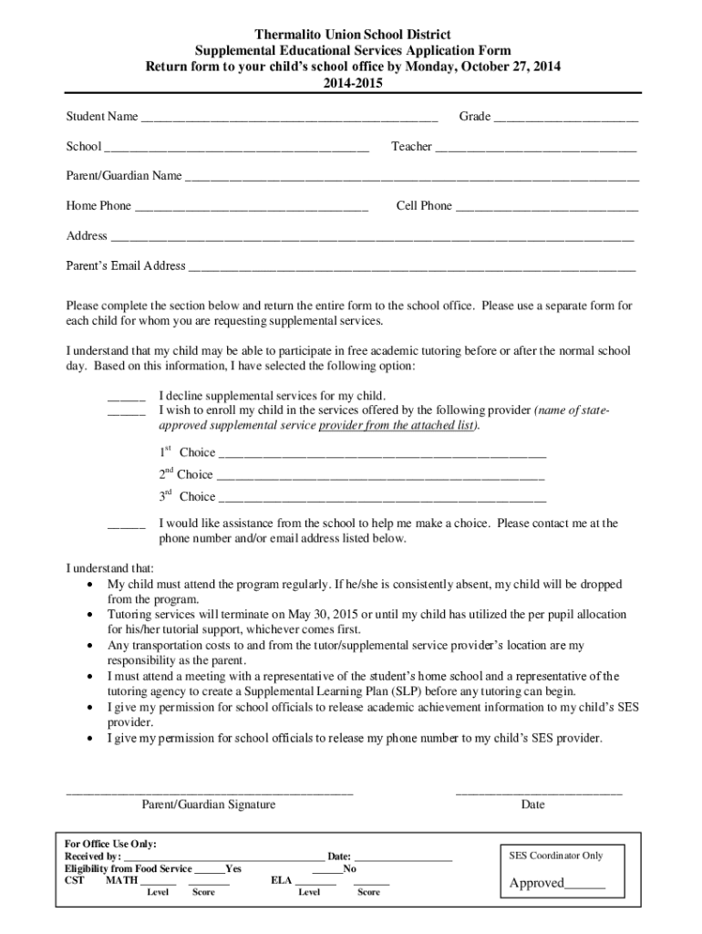 Thermalize Union School District Supplemental Educational Services Application Form Return form to your children school office by Monday, October 27, 2014 20142015 Student Name ___ School ___Grade