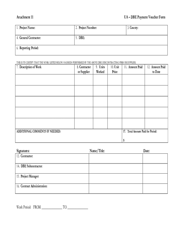 Attachment 11UA BE Payment Voucher Form1. Project Name:2. Project Number:4. General Contractor:5. BE:3. County:6. Reporting Period: THIS IS TO CERTIFY THAT THE WORK LISTED BELOW HAS BEEN PERFORMED
