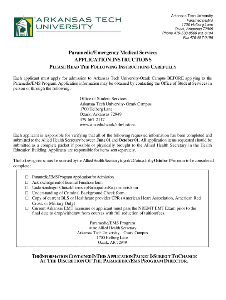 Arkansas Tech University Paramedic/EMS 1700 Hedberg Lane Ozark, Arkansas 72949 Phone 4795088500 ext. 6104 Fax 4796670198Paramedic/Emergency Medical Services APPLICATION INSTRUCTIONS PLEASE READ THE