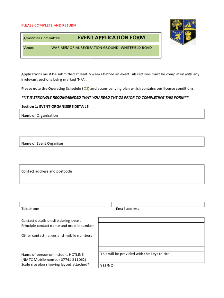 PLEASE COMPLETE AND RETURN Amenities Committee Venue EVENT APPLICATION FORMER MEMORIAL RECREATION GROUND, WHITEFIELD Reapplications must be submitted at least 6 weeks before an event. All sections
