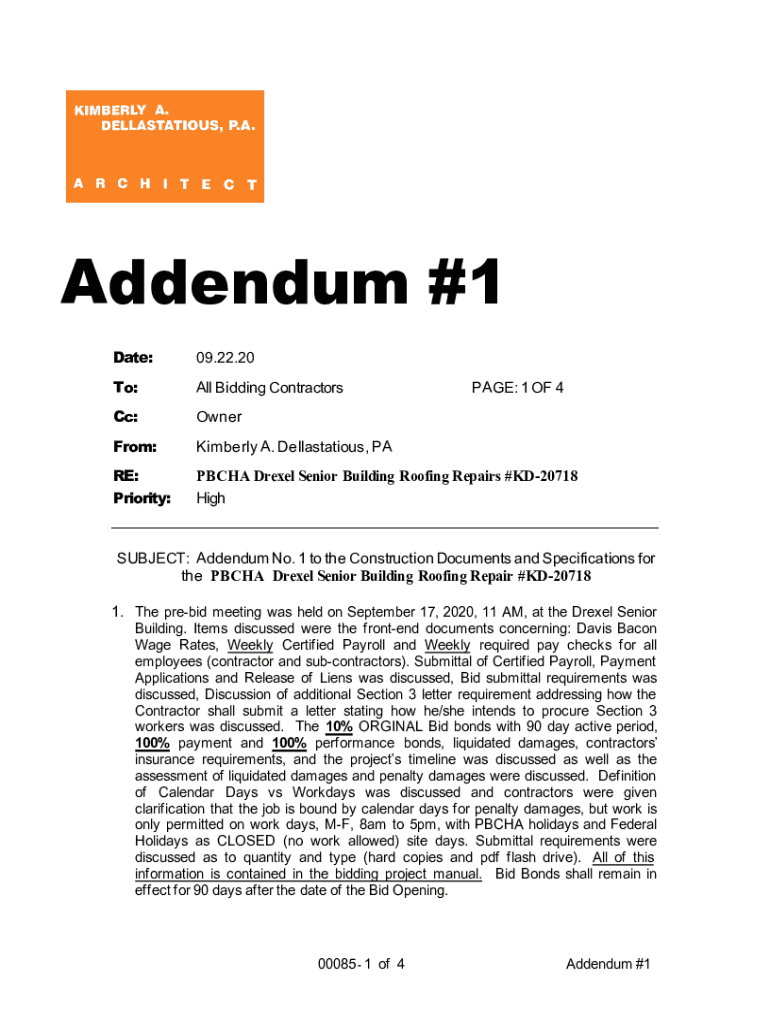 Addendum #1 Date:09.22.20To:All Bidding Contractors:Wherefrom:Kimberly A. Dellastatious, PARE: Priority:PBC HA Drexel Senior Building Roofing Repairs #KD20718 Highway: 1 OF 4SUBJECT: Addendum No.