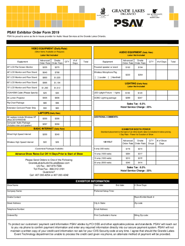 PSA Exhibitor Order Form 2019 PSA is proud to serve as the in house provider for Audio Visual Services at the Grande Lakes Orlando. VIDEO EQUIPMENT (Daily Rate) (Other Items Available on Request)AUDIO