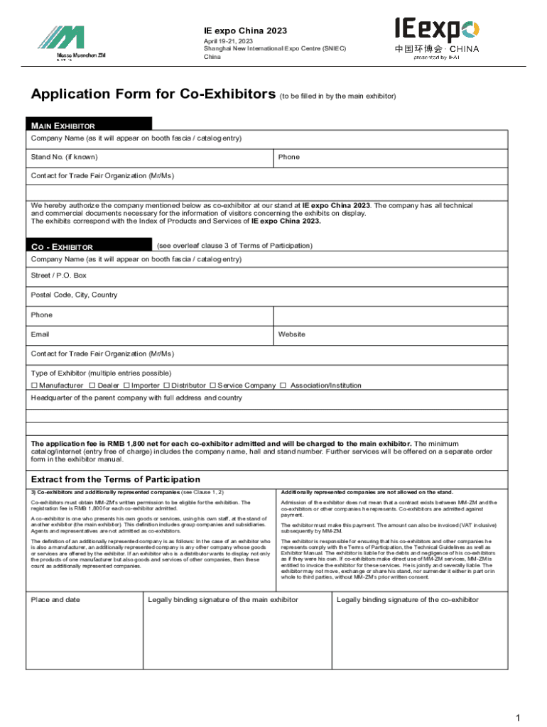IE expo China 2023April 1921, 2023 Shanghai New International Expo Center (SN IEC) ChinaApplication Form for Exhibitors (to be filled in by the main exhibitor) MAIN EXHIBITOR Company Name (as it will