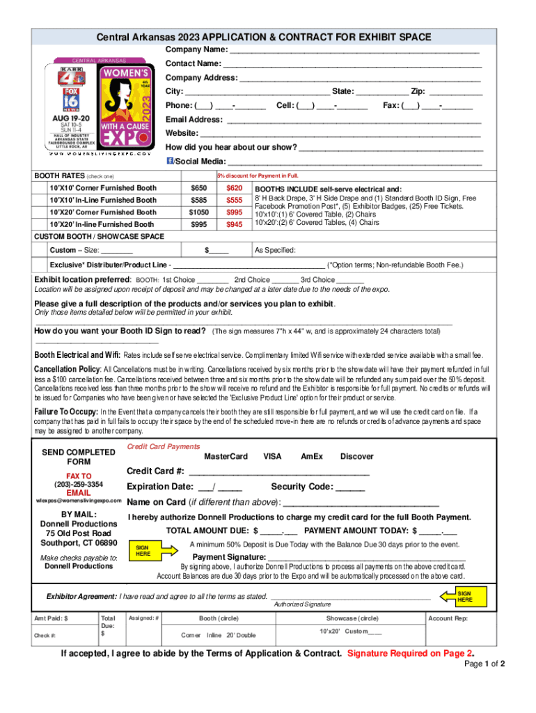 Central Arkansas 2023 APPLICATION & CONTRACT FOR EXHIBIT SPACE Company Name: ___ Contact Name: ___ Company Address: ___ City: ___ State: ___ Zip: ___ Phone: (___) ______Cell: (___) ______Fax: (___)