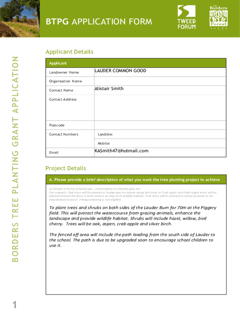 BPG APPLICATION FORM O R D E R S T R E E P L A N T I N G G R A N T A P P L I C AT I ON Applicant Details1Applicant Landowner Applauder COMMON GOODOrganisation Name Contact Name Alistair SmithContact