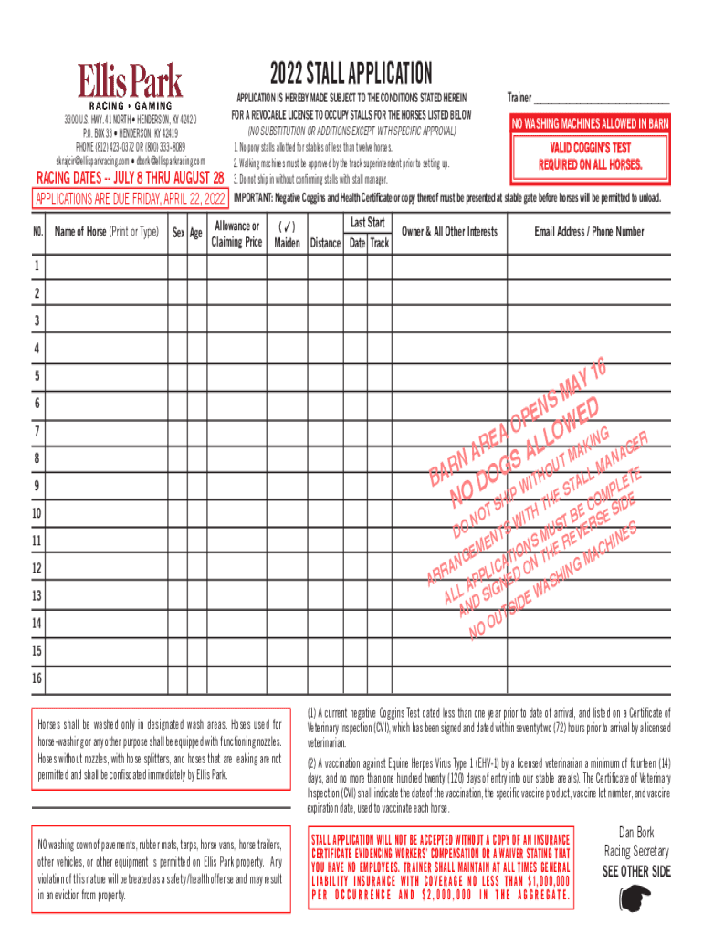 2022 STALL APPLICATIONTrainer ___RACING DATES JULY 8 Through AUGUST 28APPLICATION IS HEREBY MADE SUBJECT TO THE CONDITIONS STATED HEREIN FOR A REVOCABLE LICENSE TO OCCUPY STALLS FOR THE HORSES LISTED